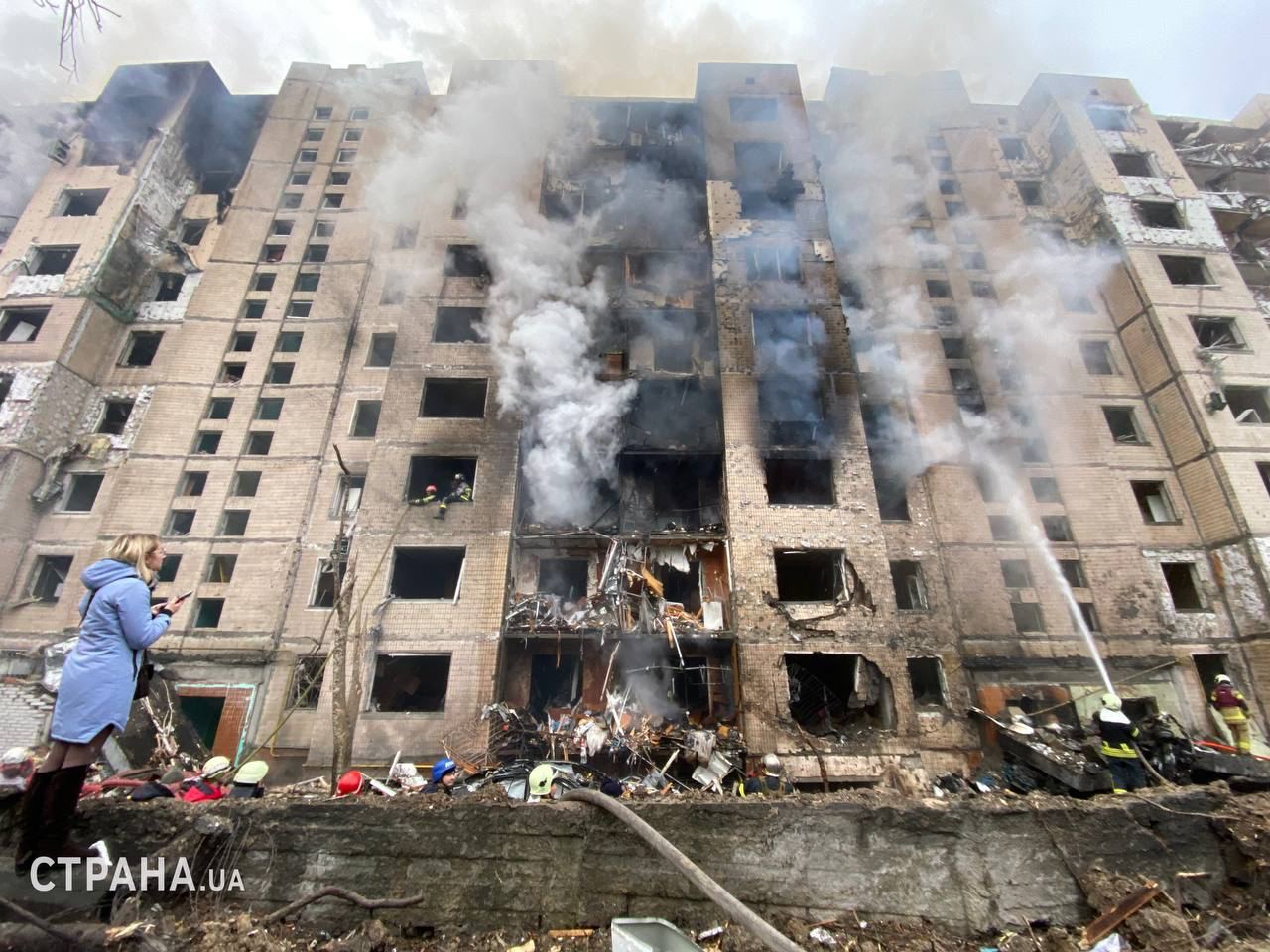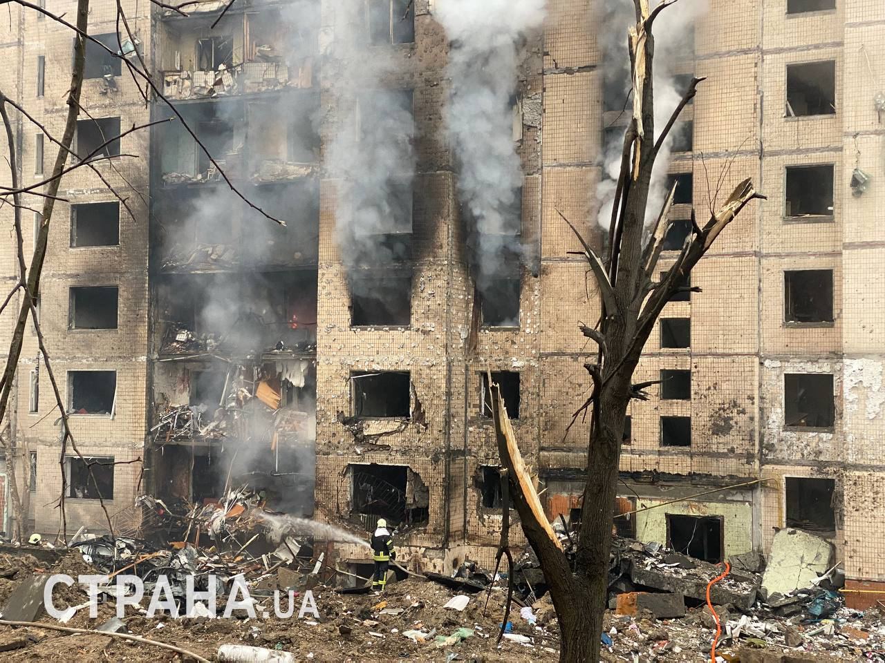 08.43 Кадры пожара в доме на Соломенке в Киеве после прилета.