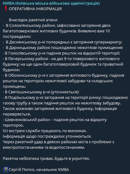 Об этом сообщает глава Киевской городской военной администрации Сергей Попко в телеграм-канале КВА.