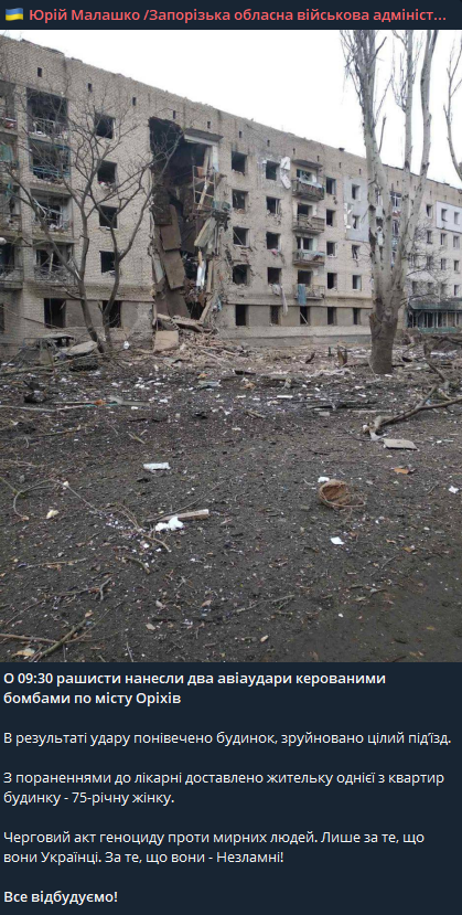 "В 09:30 рашисты нанесли два авиаудара управляемыми бомбами по городу Орехов. В результате удара изуродован дом, разрушен целый подъезд. С ранениями в больницу доставлена жительница одной из квартир дома - 75-летняя женщина", - говорится в сообщении.