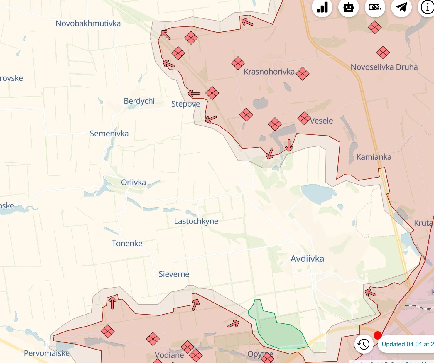 Украинский военный паблик Deep State сообщает, что у россиян был частичный успех у Хромово под Бахмутом и на севере от Авдеевки. Вчера была информация, что российские войска пытаются там прорваться к Бердычам. Российские паблики утверждают, что в районе этого населенного пункта у армии РФ был успех.