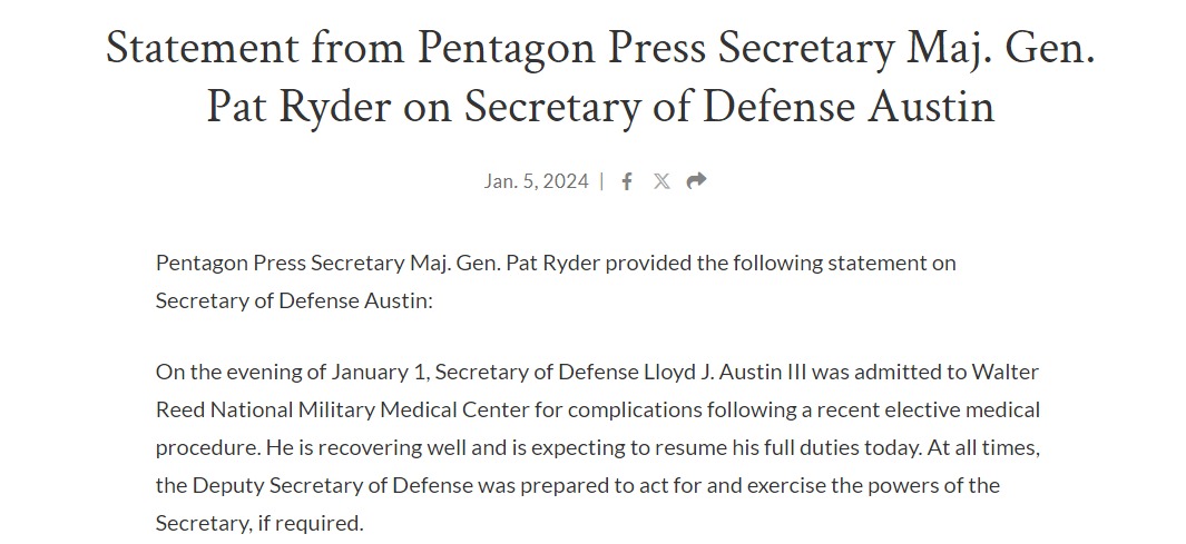 По словам Райдера, Пентагон не сообщил о госпитализации министра раньше, так как это была "развивающаяся ситуация", в которой нужно было учитывать несколько факторов. В Пентагоне не ответили на вопросы о том, находился ли глава Минобороны США без сознания во время госпитализации и пребывал ли он в критическом состоянии.