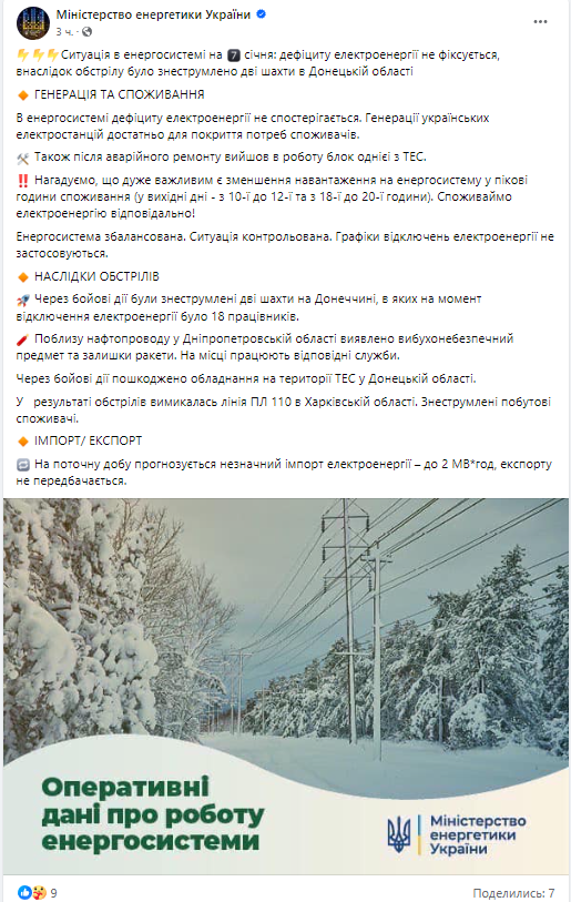 Также из-за военных действий оборудование на территории ТЭС в Донецкой области было повреждено, а в Харьковской области линия ВЛ 110 временно выключалась из-за обстрелов, что привело к отключению электричества у потребителей.