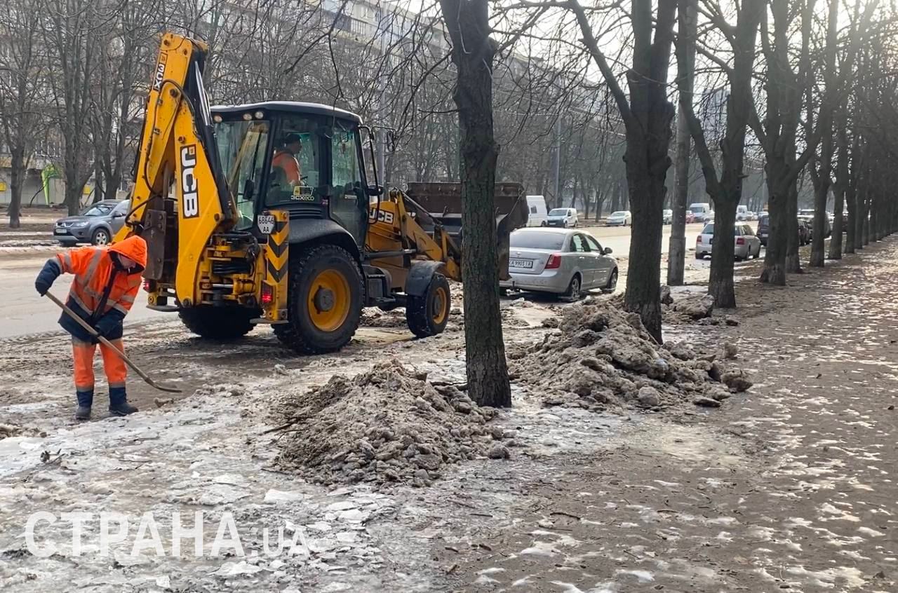 На Борщаговке в Киеве, где в ночь на 8 января произошел прорыв на улице Жюля Верна, коммунальщики с утра чистят лед, который намерз на дороге.