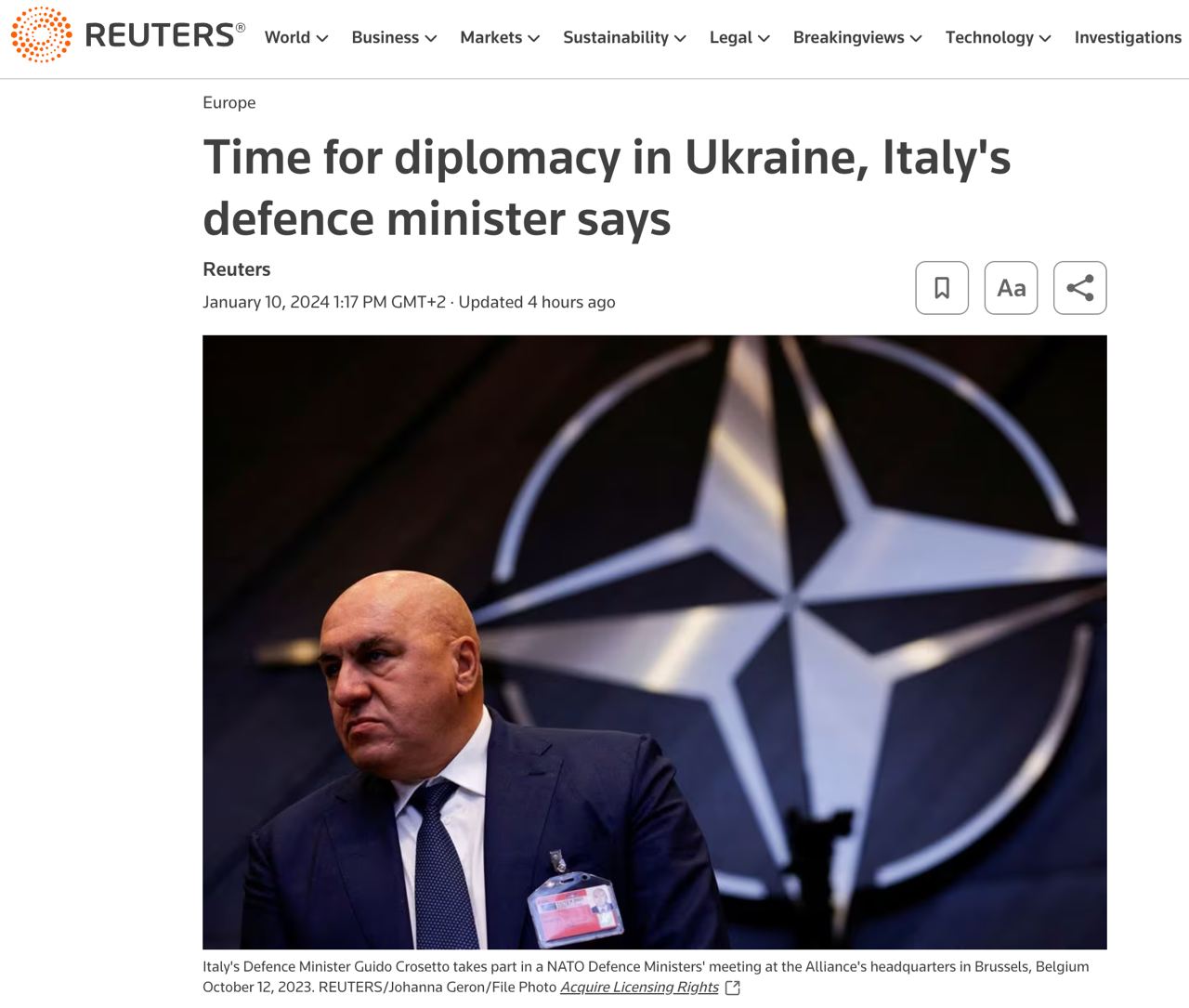 Министр обороны Италии заявил, что по Украине "пришло время для дипломатии" и переговоров - Reuters