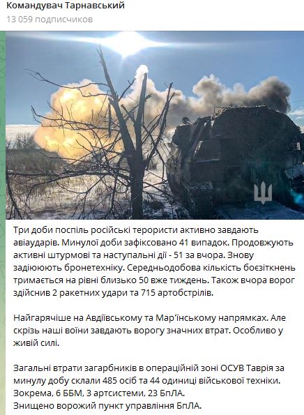 За прошедшие сутки были зафиксированы 41 авиаудар и 51 попытка наступления при поддержке бронетехники.