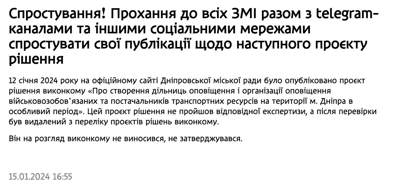 Между тем горсовет Днепра заявил, что проект решения о создании в городе групп розыска военнообязанных не прошел экспертизы и не был принят.