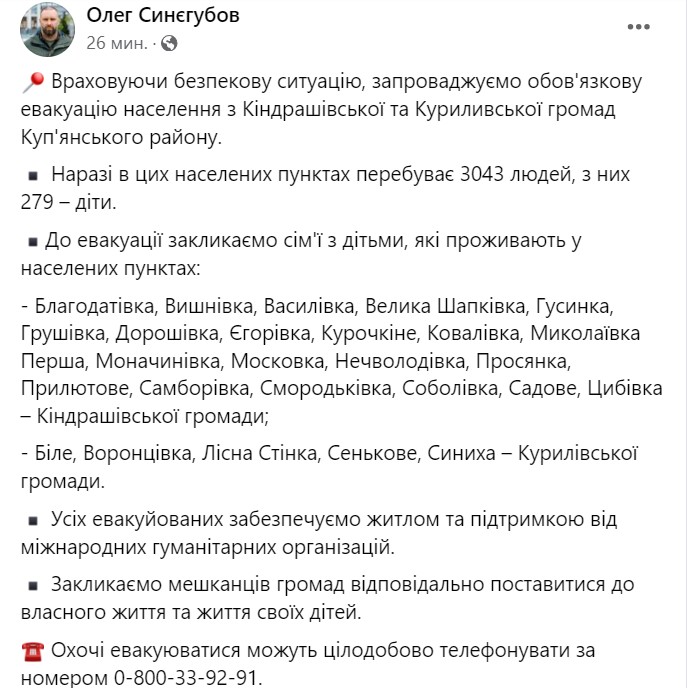 В Харьковской области объявили обязательную эвакуацию из Кондрашевской и Куриловской громад Купянского района. В настоящее время в этих населенных пунктах находятся 3043 человека, из них 279 - дети.