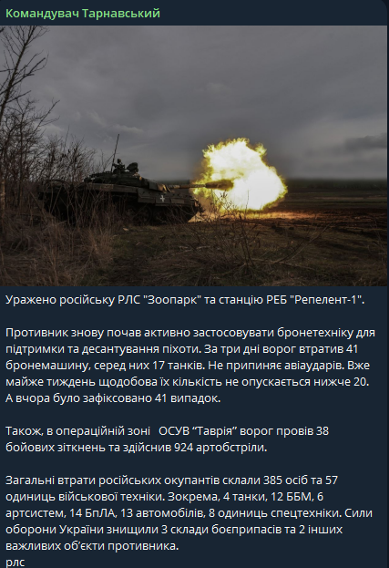 В таких условиях ВСУ удалось поразить российскую РЛС "Зоопарк" и станцию РЭБ "Репеллент-1". Кроме того, как заявляет Тарнавский, за три дня украинские военные подбили 41 бронемашину, в том числе 17 танков.