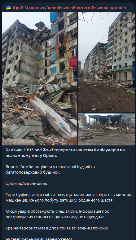 "Вражеские бомбы попали в нежилые дома и многоэтажный дом. Целый подъезд уничтожен. Горы строительного мусора – все, что осталось от жилья мирных жителей, их быта", - говорится в сообщении.