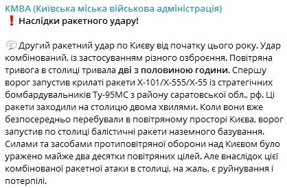 "Сначала враг запустил крылатые ракеты Х-101/Х-555/Х-55 из стратегических бомбардировщиков Ту-95МС из района Саратовской области. Эти ракеты заходили в столицу двумя волнами. Когда они непосредственно находились в воздушном пространстве Киева, враг запустил по столице баллистические ракеты наземного базирования", - заявили в администрации.