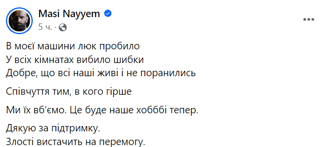 "У моей машины люк пробило. Во всех комнатах выбило стекла. Хорошо, что все наши живы и не поранились. Соболезнование тем, у кого хуже", - написал Маси Найем.