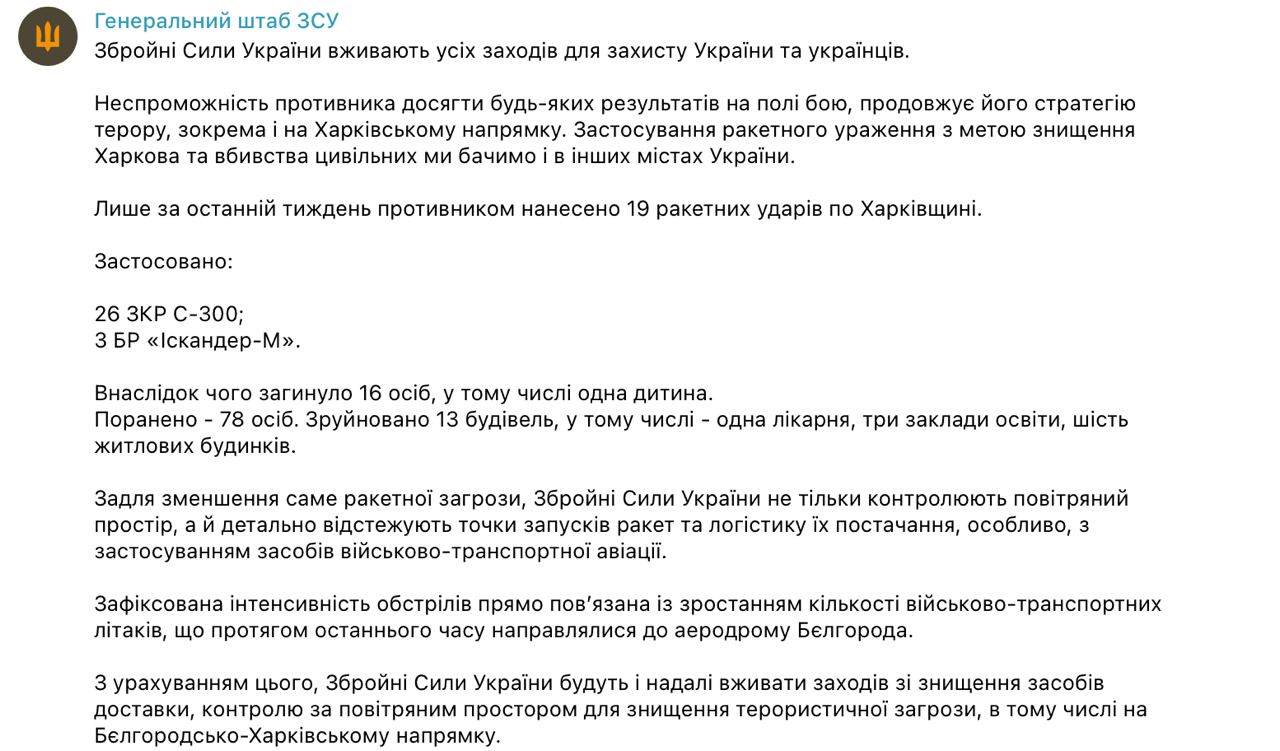 В сообщении указано, что РФ стала чаще обстреливать Харьковскую область за счет активизации поставок оружия авиацией в Белгород, а ВСУ отслеживают точки запусков ракет и логистику их поставки, особенно, с помощью авиации.