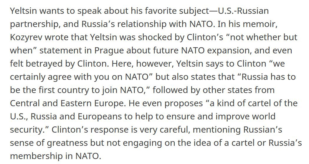 Там также упоминаются письма главы МИД Козырева, который писал, что накануне этого ужина Ельцин был шокирован заявлением Клинтона в Праге о том, что Чехия вступит в Альянс, "не если, а когда".