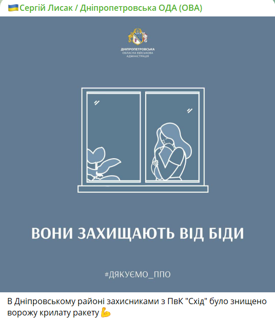 "В Днепровском районе защитниками из ППК "Восток" была уничтожена вражеская крылатая ракета", - говорится в сообщении.