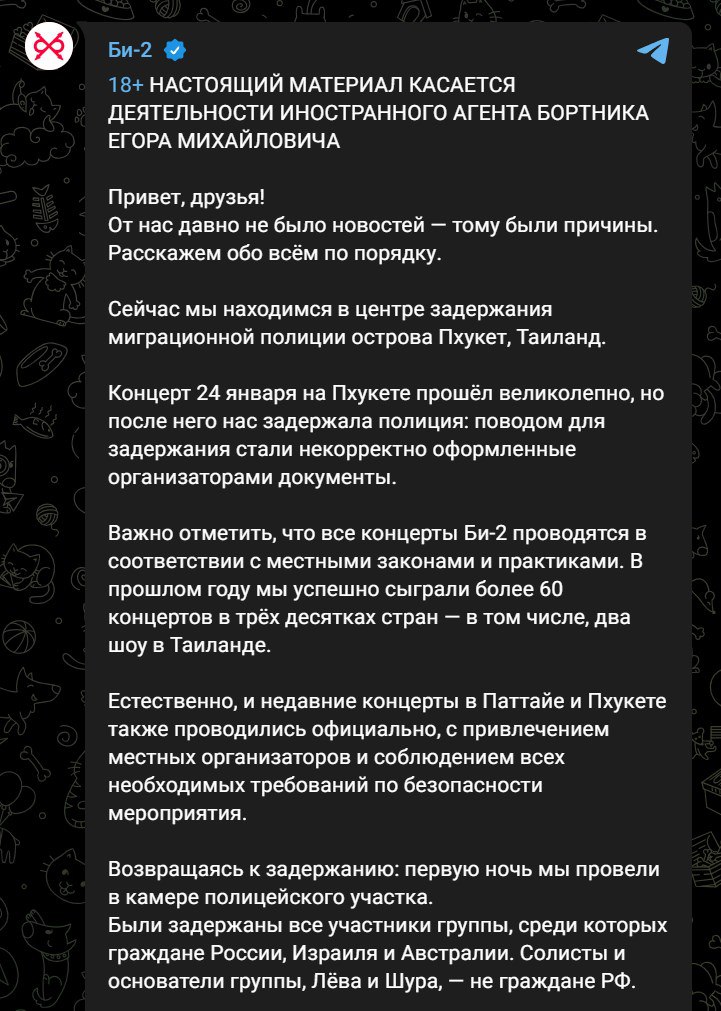 Музыканты российской группы "Би-2", поддержавшей Украину, сделали заявление из Таиланда, где их по-прежнему задерживает местная полиция. Артистов содержат в центре миграционной полиции острова Пхукет.