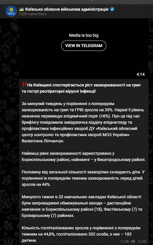 Самые высокие уровни заболеваемости зарегистрированы в Бориспольском районе, самые низкие – в Вышгородском районе. Половину от общего числа заболевших составляют дети. По сравнению с предыдущей неделей заболеваемость среди детей выросла на 44%.