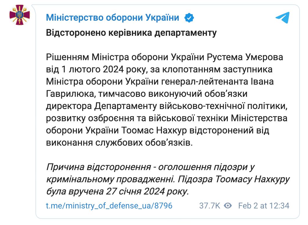 Министр обороны Рустем Умеров отстранил руководителя департамента Тоомаса Нахкура, подозреваемого по делу о хищении 1,5 миллиарда гривен на закупке снарядов для ВСУ.