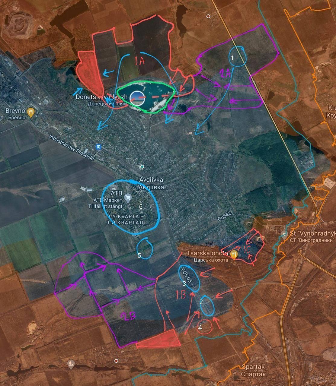 Если посмотреть на карту, то очевидны попытки россиян сжать кольцо вокруг украинского гарнизона в Авдеевке. Для этого они пытаются полностью захватить район карьера на севере города (где уже у них есть продвижение), а на юге города пробиться к району многоэтажек "9 квартал", который является "сердцем" обороны Авдеевки - оттуда просматривается и простреливается весь город. Если россияне смогут осуществить эти действия, то украинские войска в остальной части Авдеевки окажутся под угрозой полного окружения и встанет вопрос о необходимости их вывода из города.
