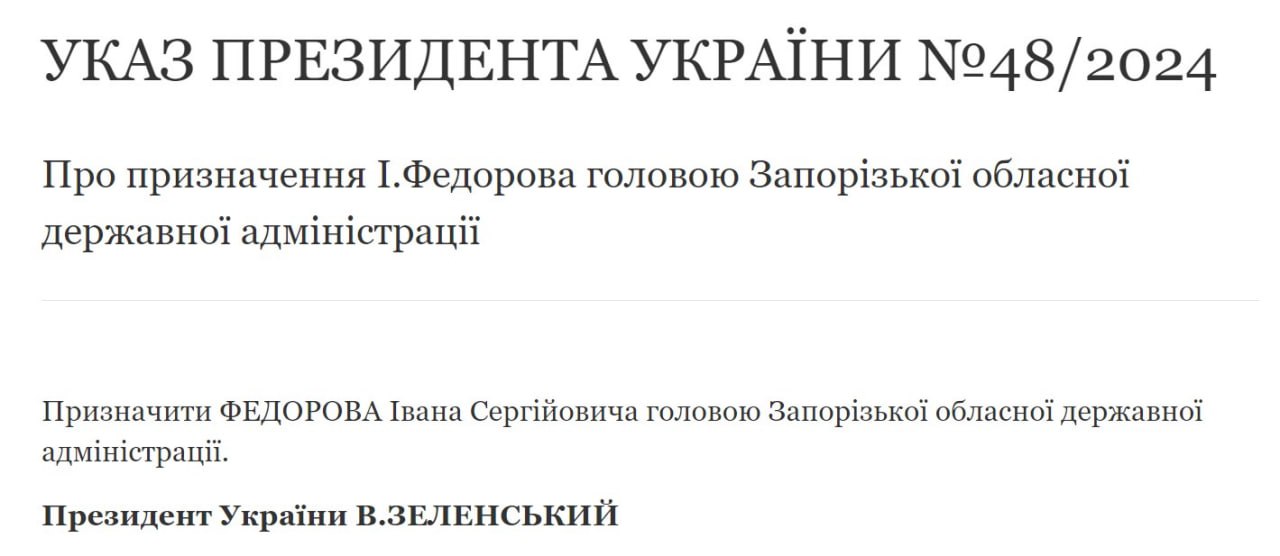 "Назначить Федорова Ивана Сергеевича главой Запорожской областной государственной администрации", - говорится в указе №48/2024.