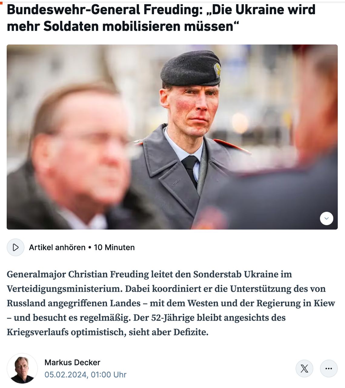 "Украине, безусловно, придется мобилизовать больше солдат – просто из-за количества потерь, насколько мы видим. Но еще и потому, что войска, часть которых находится на фронте уже 24 месяца, нуждаются в обновлении", - сказал Фрейдинг.