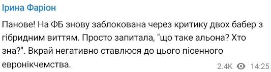 "На ФБ снова заблокирована из-за критики двух бабер с гибридным воем. Просто спросила, "что такое алена? Кто знает?" Крайне негативно отношусь к этой песенной евроникчёмности", - написала Фарион следом в своем Telegram-канале.