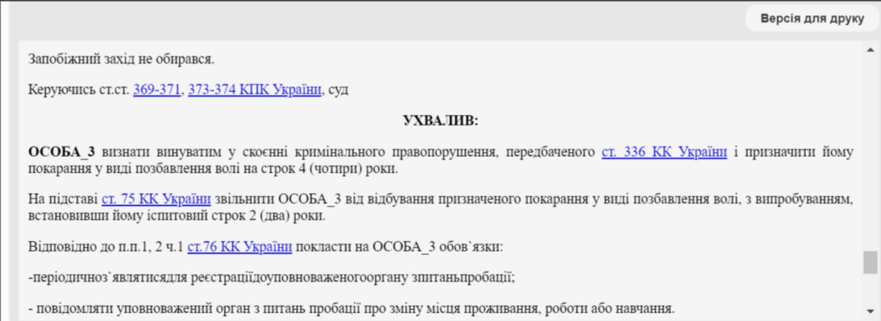 В Ровенской области к двум годам лишения свободы с испытательным сроком приговорили мужчину, который в помещении ТЦК отказался брать повестку и подвергаться мобилизации.