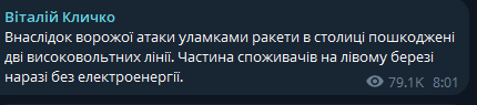 Также Виталий Кличко сообщил, что в результате вражеской атаки повреждена магистраль теплоснабжения на левом берегу столицы. Специалисты выясняют масштабы и безотлагательно приступят к ремонтным работам.
