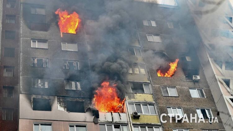 В Киеве в Голосеевском районе после ракетной атаки горит многоквартирный дом.