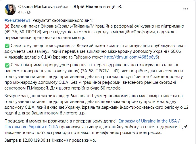 "Лидер большинства Шумер сообщил, что намерен вынести на голосование вопрос о прекращении дебатов по законопроекту о международной помощи США, который включает Украину, Израиль и государства Индо-тихоокеанского региона, в 12 часов дня по Вашингтону 8 февраля", - написала Маркарова.