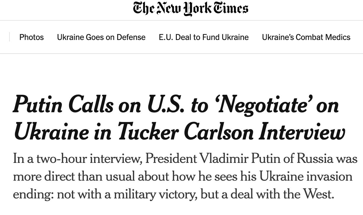 "Владимир Путин призвал США "вести переговоры" по Украине в интервью Такеру Карлсону".