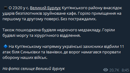 "В 23:20 возле с. Большой Бурлук Купянского района в результате ударов беспилотников разрушено кафе. Горело помещение на первом и втором этаже. Без пострадавших", - сообщил Синегубов.