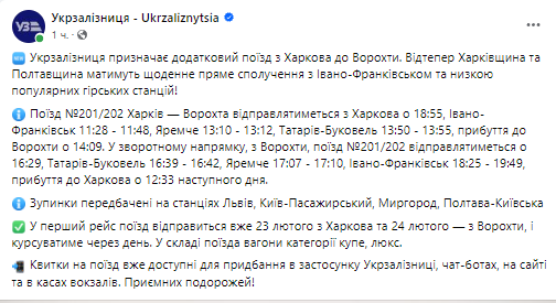 "Укрзализныця" запустит новый дополнительный маршрут поезда, который будет ездить из Харькова в Ворохту Ивано-Франковской области, а также в обратном направлении. В результате Харьковская и Полтавская области получат ежедневное прямое сообщение с Ивано-Франковском.