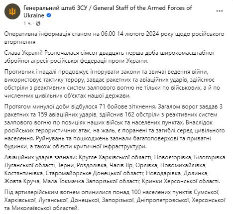 Война в Украине идет уже 721-й день. Мы следим за последними новостями и ключевыми событиями 14 февраля 2024 года в обновляемом онлайне.