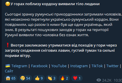 "Сегодня утром румынские пограничники задержали мужчин, незаконно перешедших украинско-румынскую границу. Они сообщили, что вместе с ними был еще один исчезнувший украинец. В результате поисковых мероприятий в горах на территории Румынии обнаружили тело мужчины без признаков жизни" - говорится в заявлении.