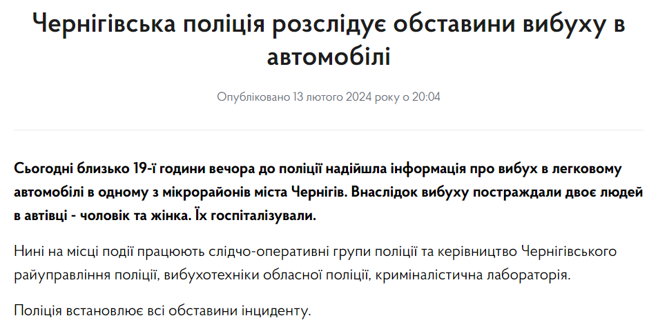 В сообщении Национальной полиции говорится, что взрыв произошел 13 февраля около 19 часов вечера в легковом автомобиле в одном из микрорайонов города Чернигова.