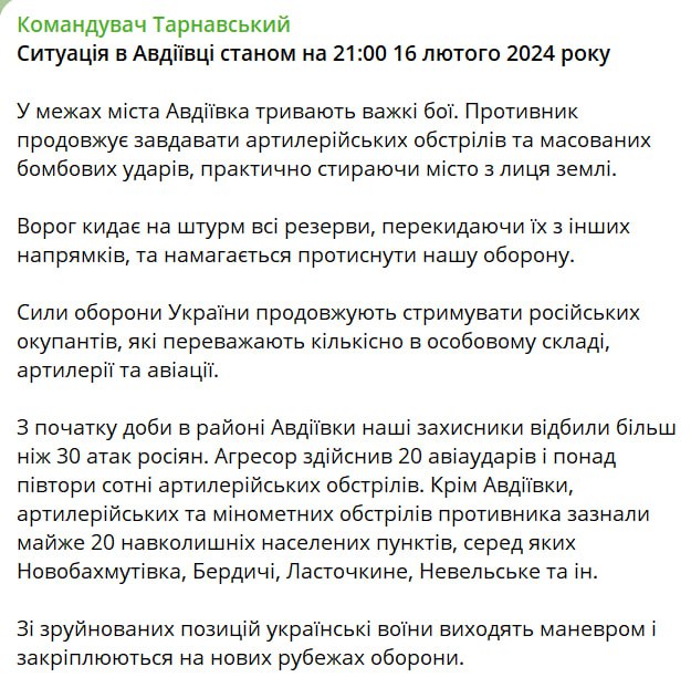 В пятницу, 16 февраля, в Украине идет 723-й день войны с Россией.