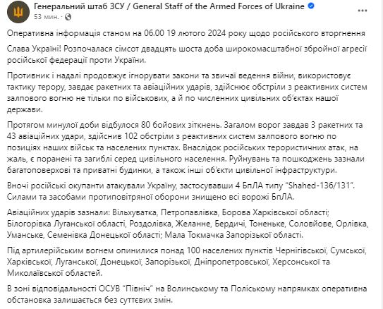 Утром 19 февраля Генштаб ВСУ обнародовал сводку о ситуации на фронте за минувшие сутки.
