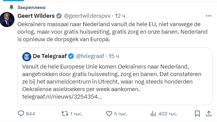 "Украинцы стекаются в Нидерланды со всего Евросоюза не из-за войны, а ради бесплатного жилья, бесплатной медицины и рабочих мест. Нидерланды снова стали сельским идиотом Европы", - заявил политик.