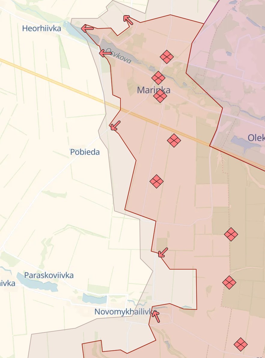 Российские же паблики заявляют о продвижении к югу от Марьинки и занятии более чем половины села Победа (а к вечеру российские телеграм-каналы заявили о полном захвате этого населённого пункта). Украина этих данных не подтверждала.