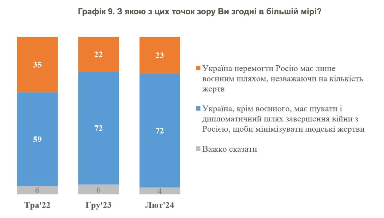 При этом большинство согласно, что помимо военного нужно искать и дипломатический путь завершения войны. Эта цифра выросла с 59% до 72%.