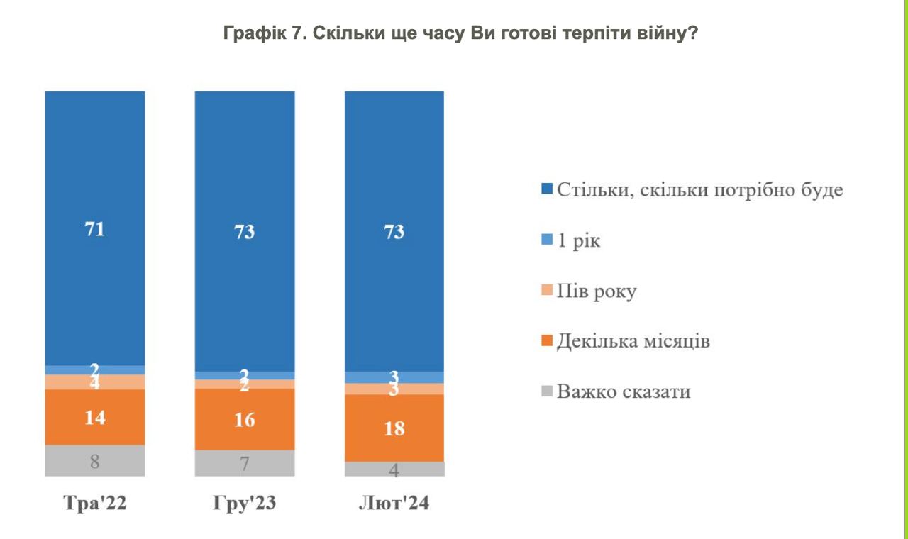 Готовность терпеть войну "столько, сколько потребуется", остается на том же уровне уже почти 2 года - в районе 71-73%. Но выросло и количество тех, кто готов терпеть только еще несколько месяцев - с 14 до 18%.