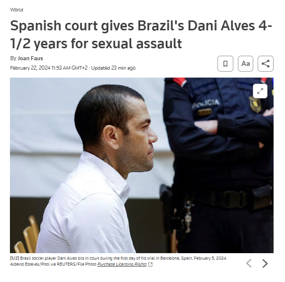 Одного из самых титулованных футболистов в истории Дани Алвеса приговорили к 4,5 года лишения свободы за изнасилование.