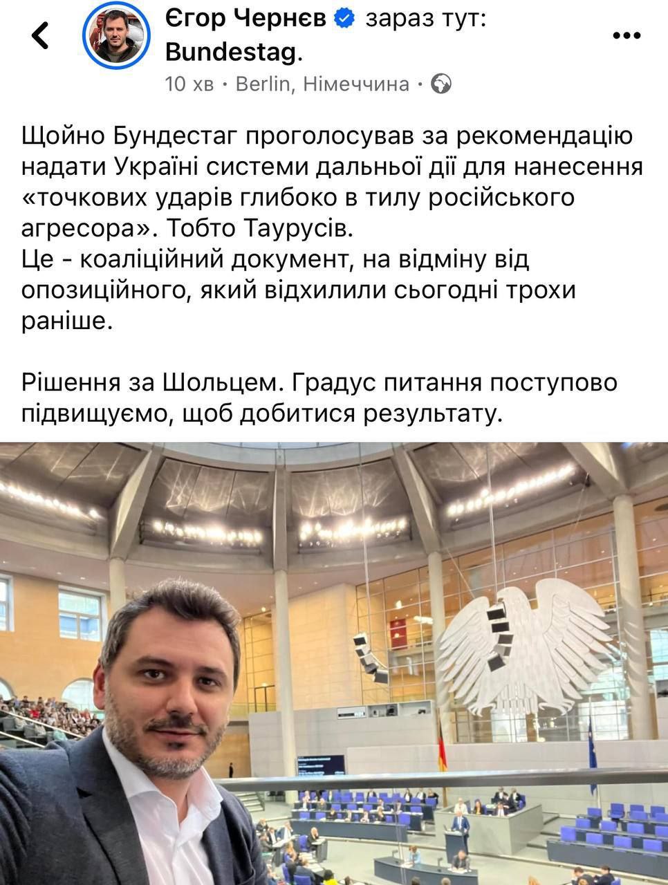 В свою очередь глава постоянной делегации Украины в ПА НАТО Егор Чернев сообщил, что Бундестаг проголосовал за рекомендацию предоставить Украине системы дальнего действия для нанесения "точечных ударов глубоко в тылу российского агрессора".