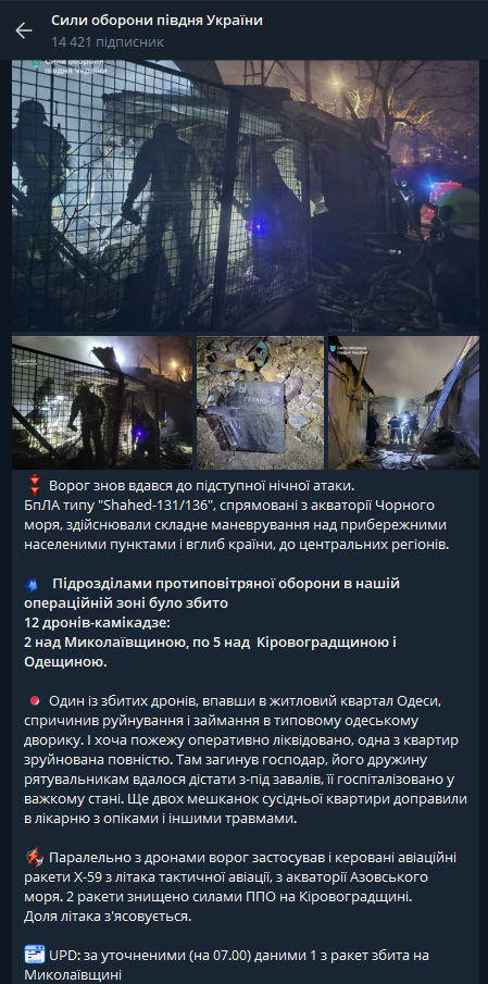 "Один из сбитых дронов, упав в жилой квартал Одессы, вызвал разрушение и возгорание в типичном одесском дворике. И хотя пожар оперативно ликвидирован, одна из квартир разрушена полностью. Там погиб хозяин, его жену спасателям удалось достать из-под завалов, она госпитализирована в тяжелом состоянии. Еще двух жительниц соседней квартиры доставили в больницу с ожогами и другими травмами", - рассказали военные.