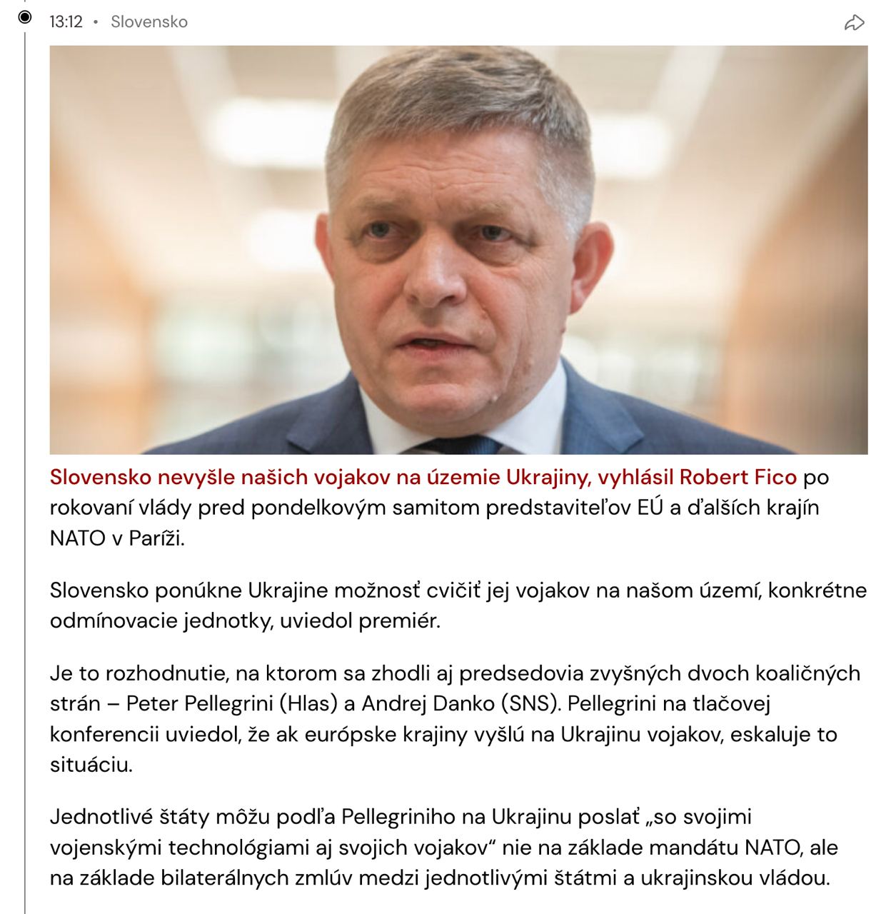 "Стратегия Запада в Украине провалилась. Но я хочу быть конструктивно подготовлен, несмотря на то, что от тем, о которых мы говорили, идет мороз по коже. Из этих тезисов следует, что группа стран НАТО и ЕС обдумывают, что на базе двусторонних соглашений отправят в Украину своих военных", — сказал Фицо после заседания словацкого Совбеза.