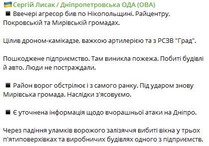 07.30 Вечером силы РФ ударили по Никополю, Покровской и Мировской громаде в Днепропетровской области.