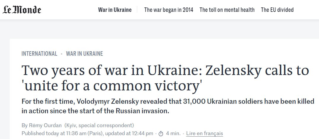 23.00 Украинский военный Станислав Бунятов, который ведет известный телеграмм-канал "Говорять Снайпер", прокомментировал заявление Владимира Зеленского о том, что с начало войны погибли 31 тысяча украинских военнослужащих.