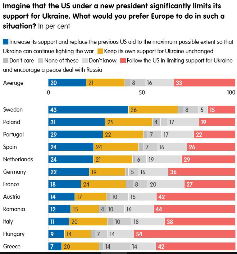 В целом исследование показало, что граждане Европы не в особо оптимистическом настроении. Меньшинство европейцев: в среднем всего 20% - от 7% в Греции до 43% в Швеции - хотели бы, чтобы Европа увеличила свою поддержку Украины.