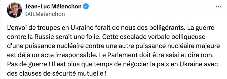 "Отправка войск в Украину сделает нас воюющей стороной. Война с Россией была бы безумием. Эта воинственная словесная эскалация одной ядерной державы против другой крупной ядерной державы уже является безответственным поступком. Необходимо попросить парламент сказать "нет". Нет войне! Настало время договориться о мире в Украине с взаимными условиями безопасности!", - написал Меланшон, который является одним из ведущих оппозиционных политиков Франции.