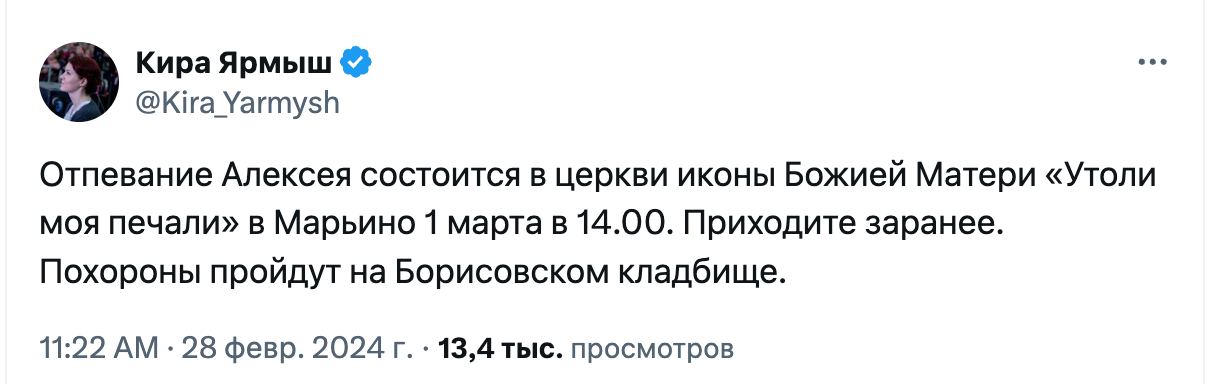 24 февраля Ярмыш сообщила, что тело российского оппозиционера Навального передали его матери.